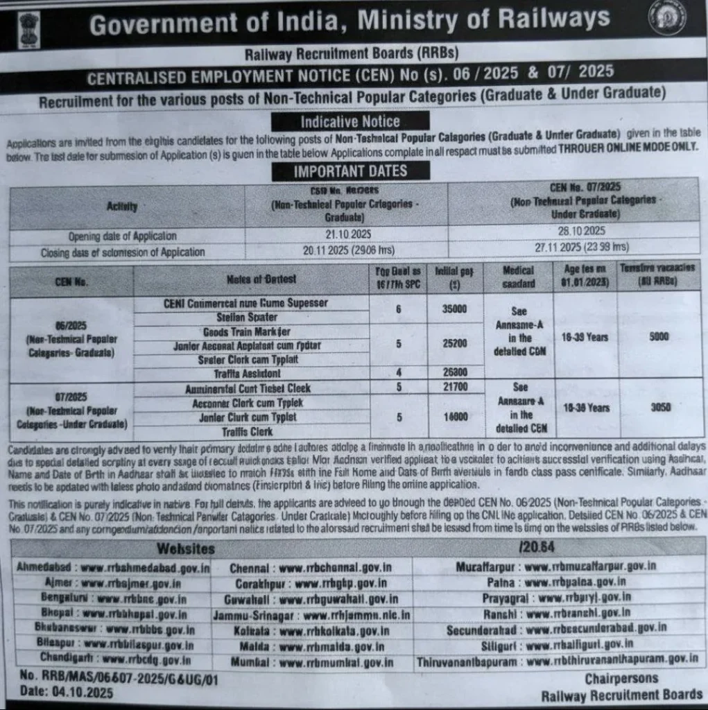 RRB NTPC Vacancy 2025 के तहत कुल 8,875 पदों पर उम्मीदवारों की भर्ती की जाएगी।